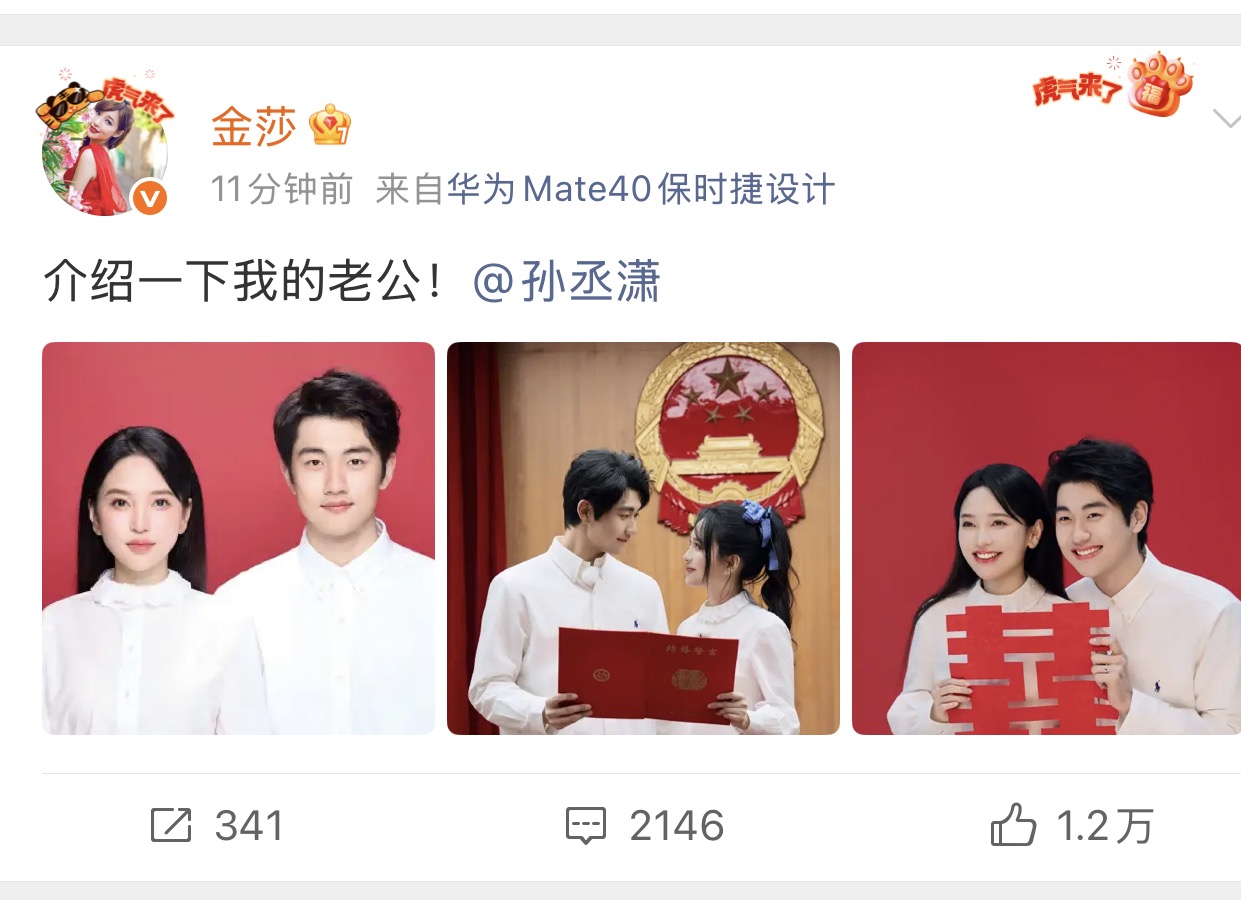 金莎更新微博官宣与孙程潇结婚 图据金莎微博